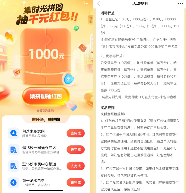支付宝搜索“时光拼图”->简单浏览得拼图,集齐4块拼图抽红包或出行券等奖励