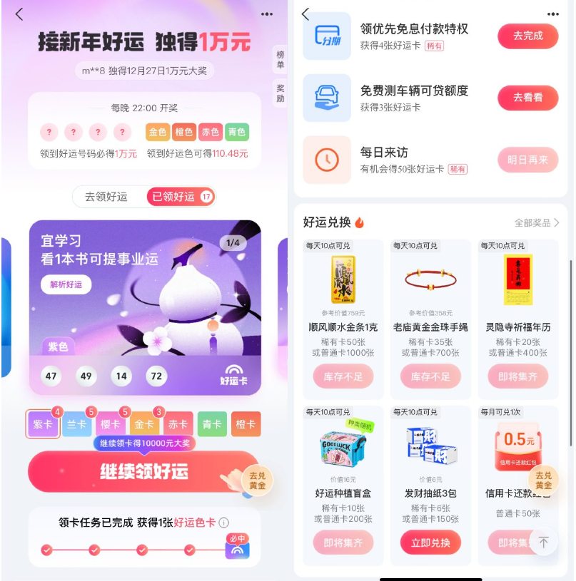 支付宝搜索“好运卡”->简单浏览得好运卡->累计卡片每天10点开始兑换实物包邮