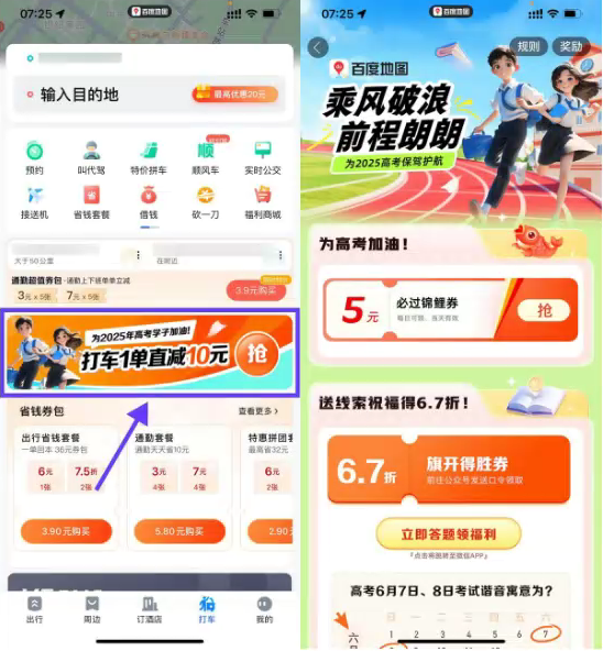 百度地图APP底部“打车”->点横幅进入->直接领5亓打车券