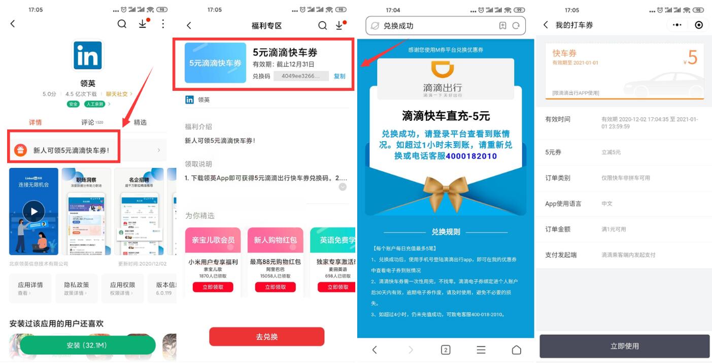 打开小米应用商店->搜索“领英”->进来后中间就有显示“新人可领5元”->点进去下载->返回复制兑换码->打开链接兑换即可