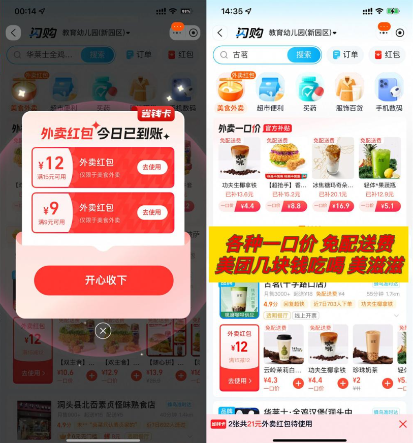 淘宝搜索“饿了么”进入->点击闪购入口进入->自动弹10~15亓外卖红包->页面有很多一口价商品->右下角抽100万奶茶免单!