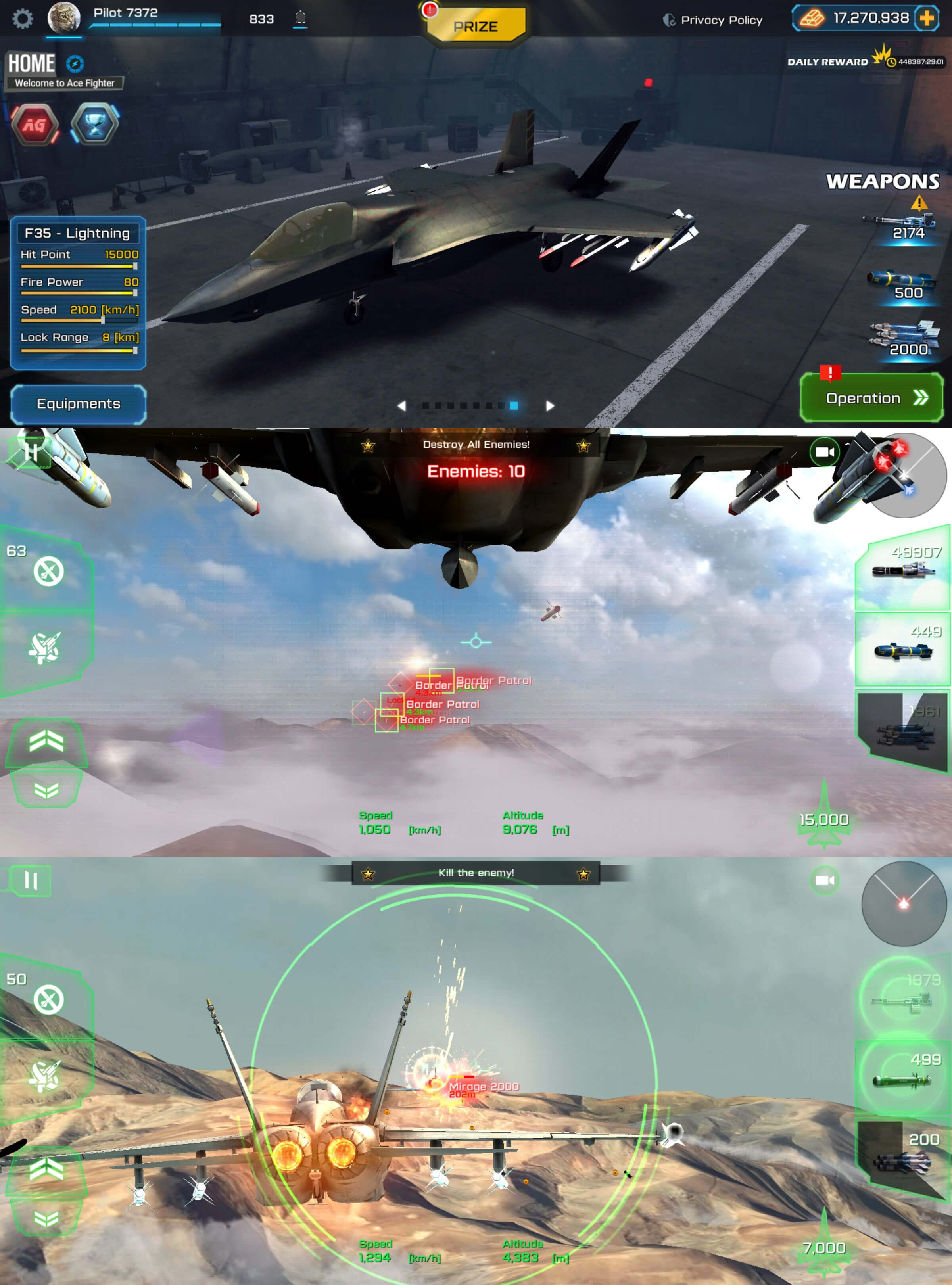 王牌战斗机是一款超过瘾的空战对战游戏,超多关卡多种对战模式,告别单一模式,超多现代机型供你选择,更有慢动作特效,宛如大片上映,尽情享受酣畅淋漓的空中角逐。(金钱逆增长)