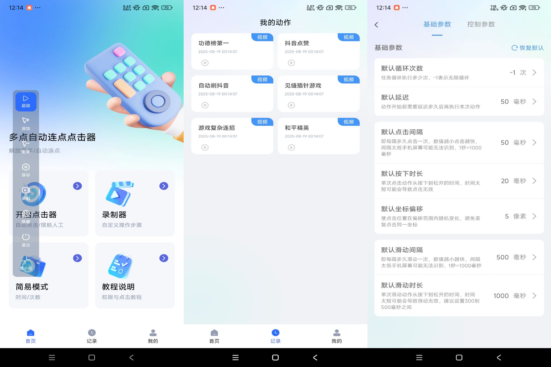 一款手机多点自动连点点击器App,解放双手,效率翻倍! 可以模拟多点触摸操作,实现自动点击、滑动等功能,用于游戏、软件等场景,提高操作效率。 界面简洁,操作便捷,是你的游戏辅助和自动化工具。(解锁VIP功能)