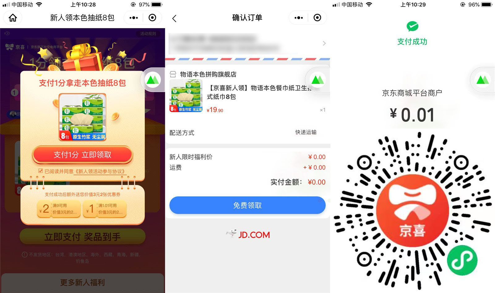 京喜新用户活动,微信扫码进入,新用户可以0.01元购买四季毯子、抽纸8包、洗衣液4斤、电子手表、沙琪玛500g、口罩20只、乐事薯片5包、干脆面21包、手帕纸24包、毛球修剪器等等实物,还是新用户的可以搞下。