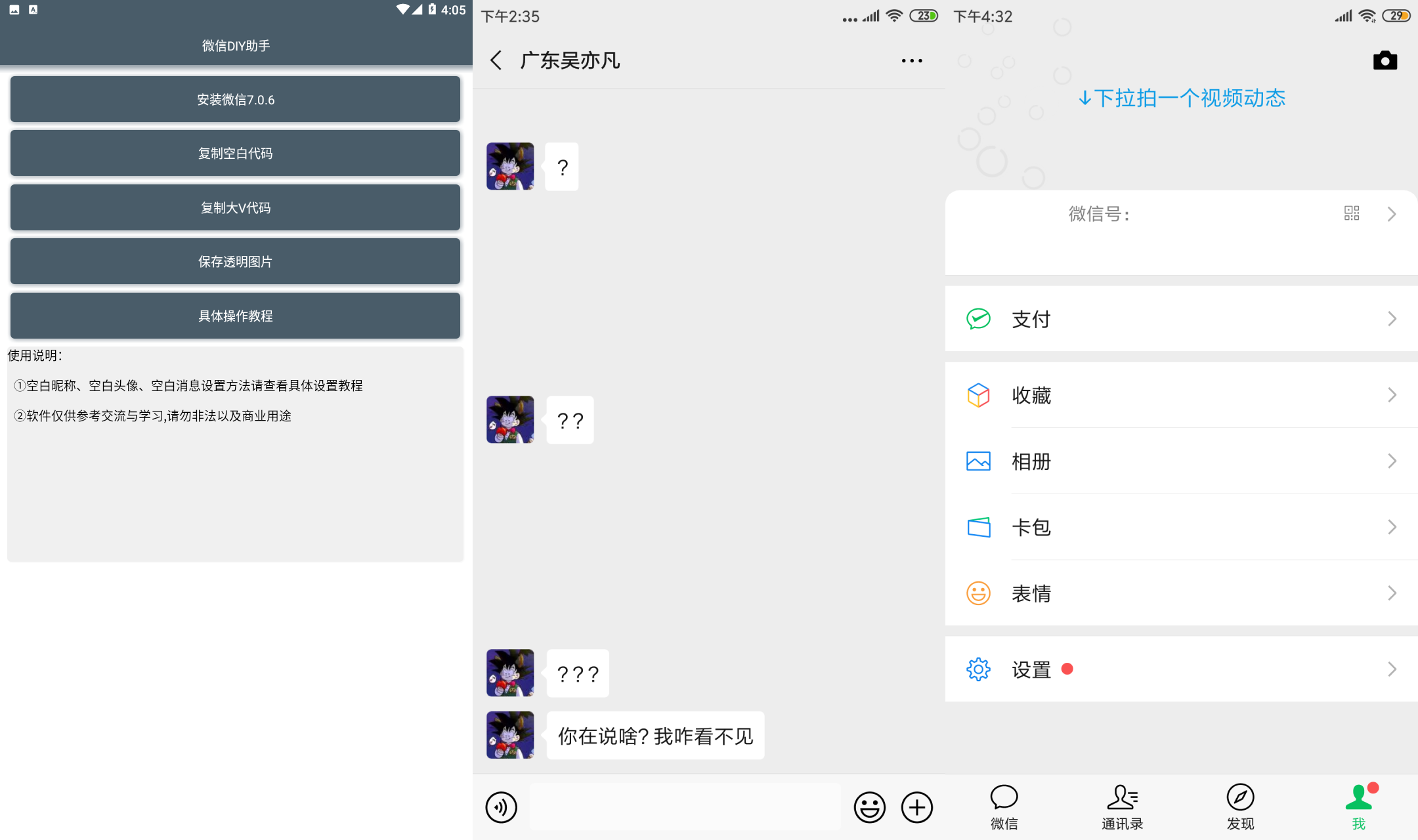 微信DIY助手一键制作空白昵称、头像、信息,只需简单几步配置,即可拥有个性微信空白昵称,头像,恶搞消息,朋友圈。 聊天B格翻倍,做好友列表中最靓的仔。