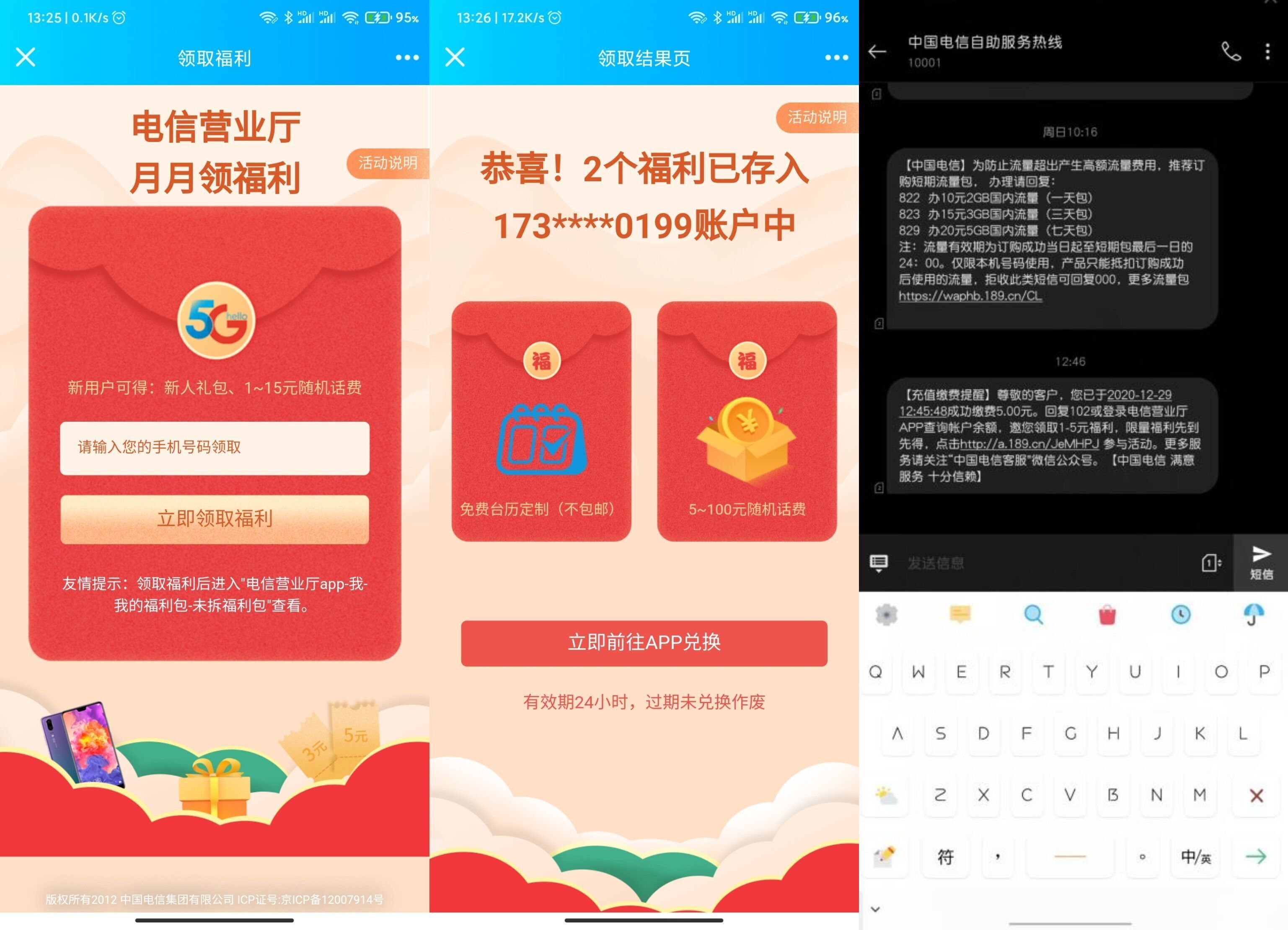 打开地址->提示获得5元随机话费就是中了->然后打开电信APP->我->我的福利->拆开话费秒到