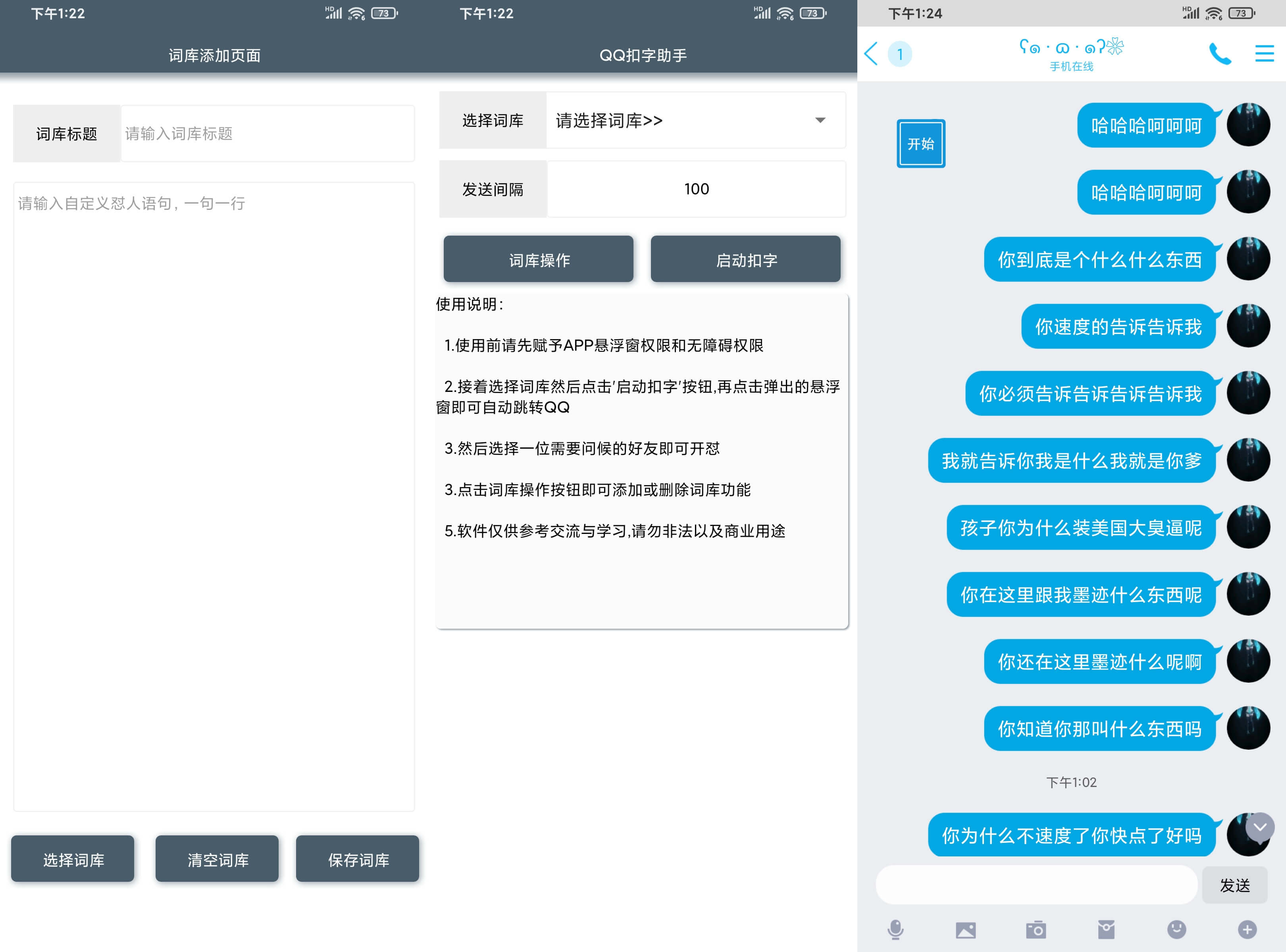 QQ扣字助手2.0强势来袭。解放你的双手,支持扣扣好友私聊、群聊,自定义词库一键开启自动发送,怼天怼地怼空气特别强悍,遇到喷子骗子再也不怕。