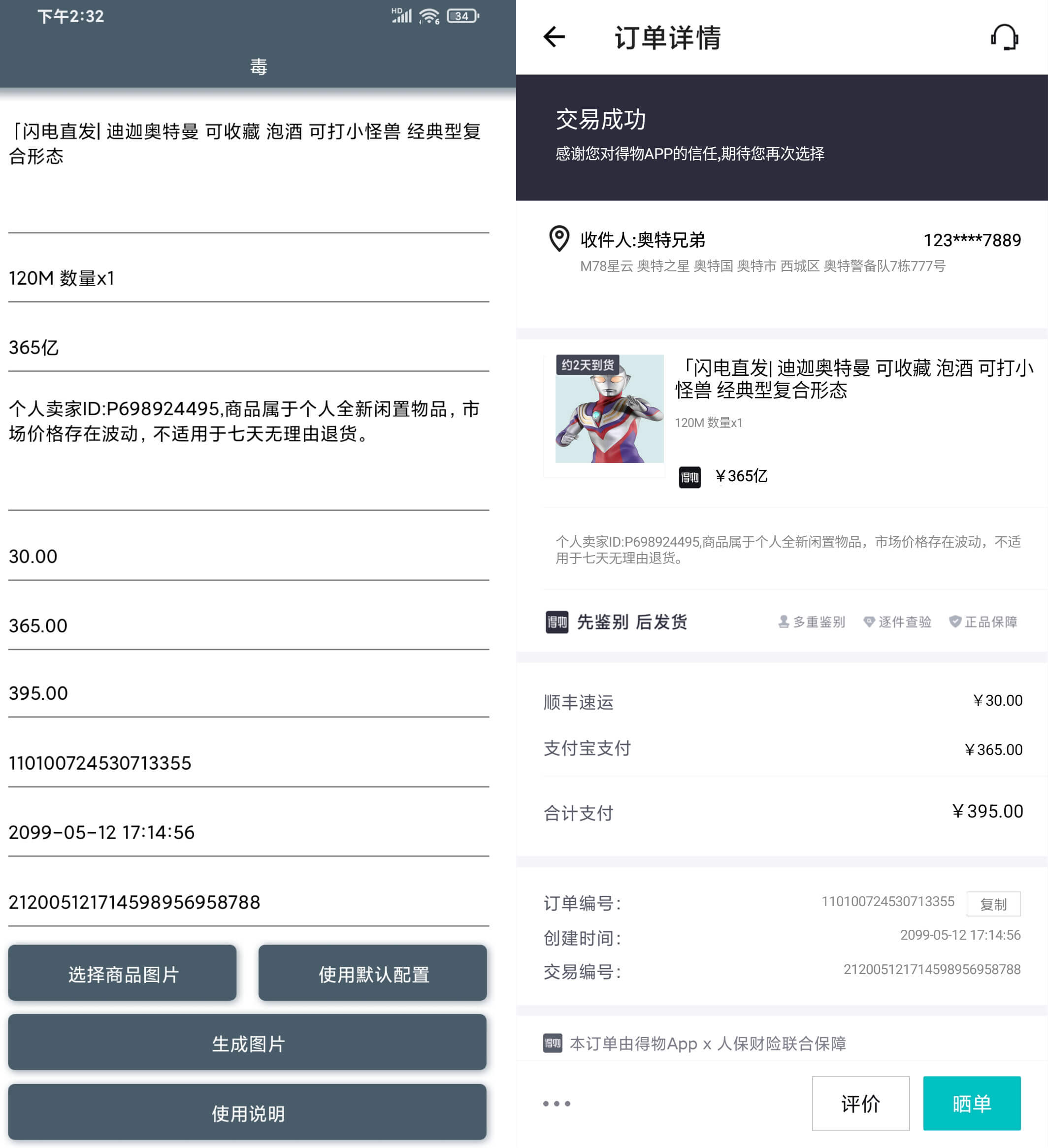 得物订单生成APP一键生成恶搞装X毒订单,自定义DIY订单信息,野生奥特曼都可以卖,在这里只要你想得到的物品,都可以来制作成为订单,简直就是空间朋友圈装X恶搞整蛊必备APP,软件仅供娱乐,请勿用于非法以及商业用途,否则后果自负。
