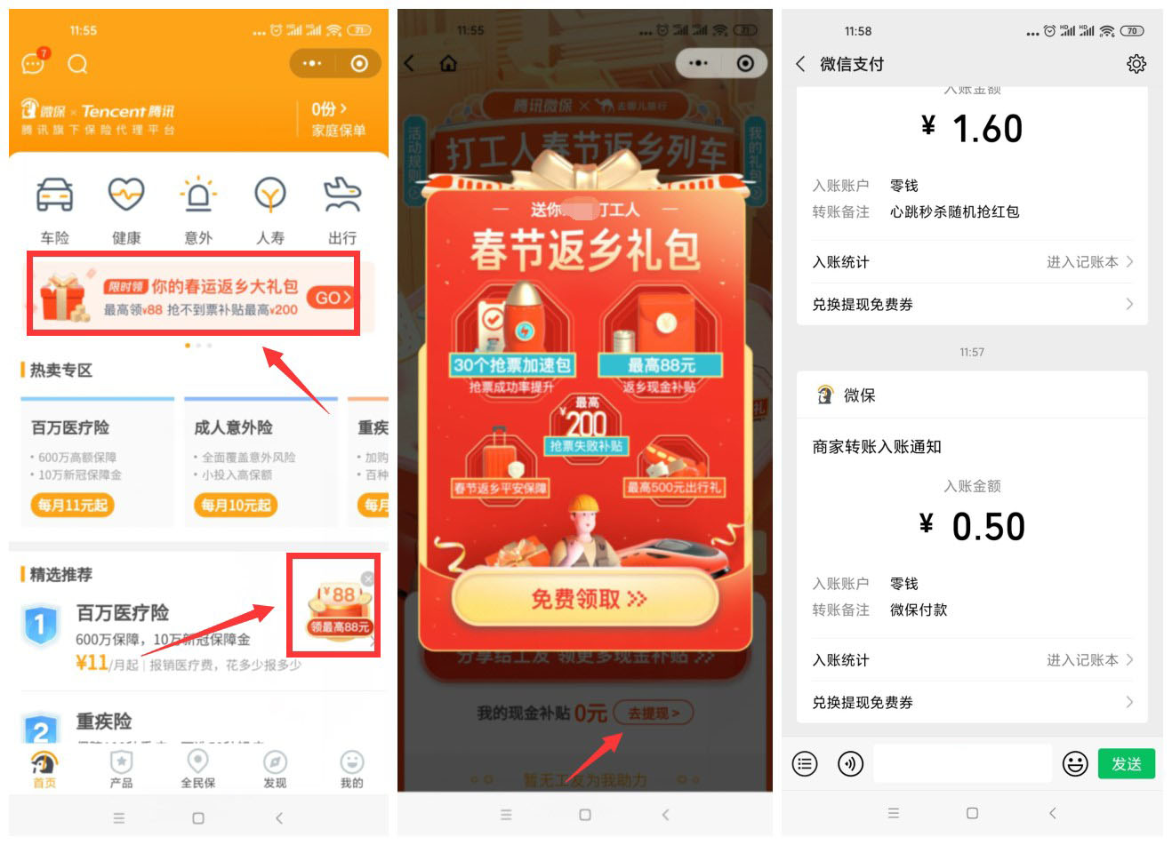 1、微信小程序搜索“微保”->首页->中间轮播图->春运返乡大礼包