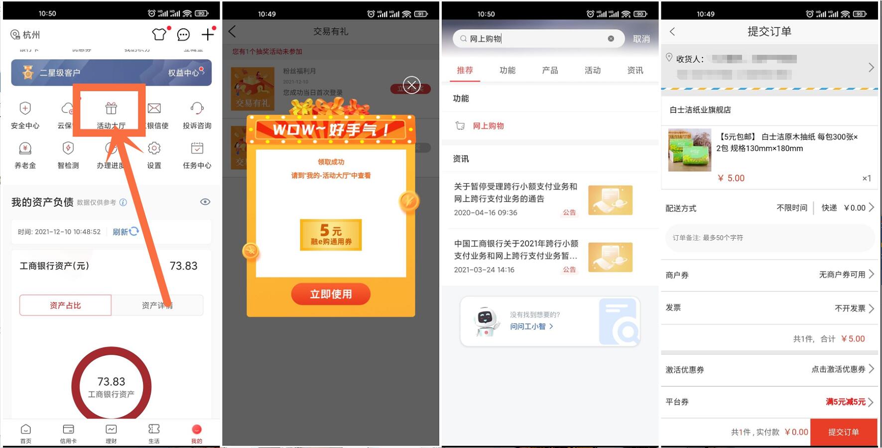 2、两次只有中了通用券才有用->定向券没有用->然后去首页搜索“网上购物”