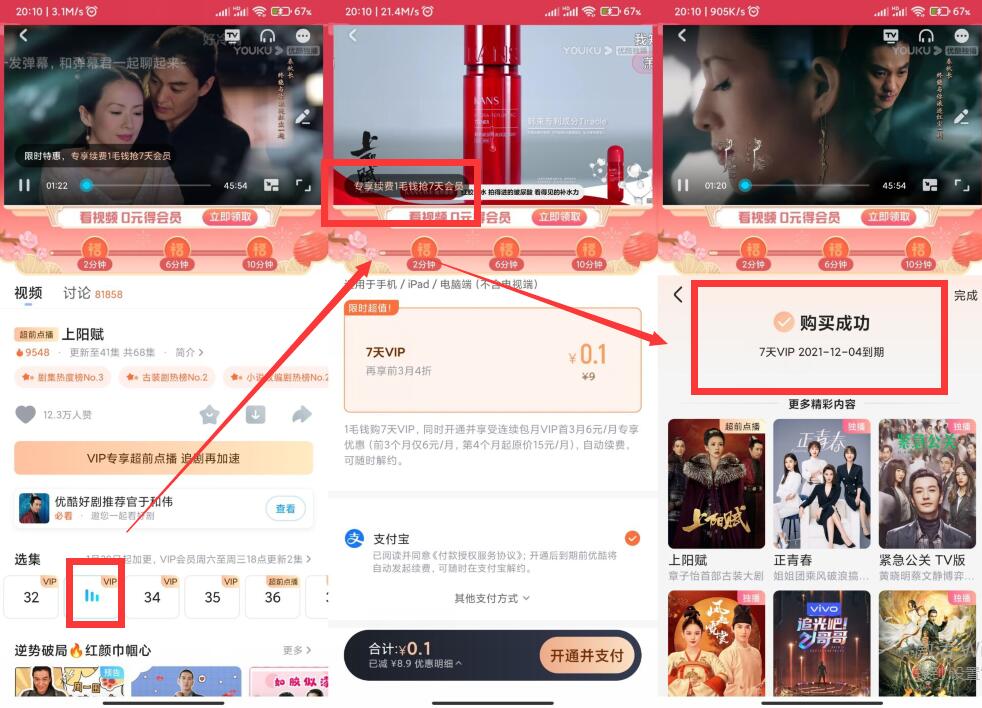 1、打开优酷视频APP->首页->随便找个会员电视->左滑到VIP剧集->画面就会出现->1毛抢7天
