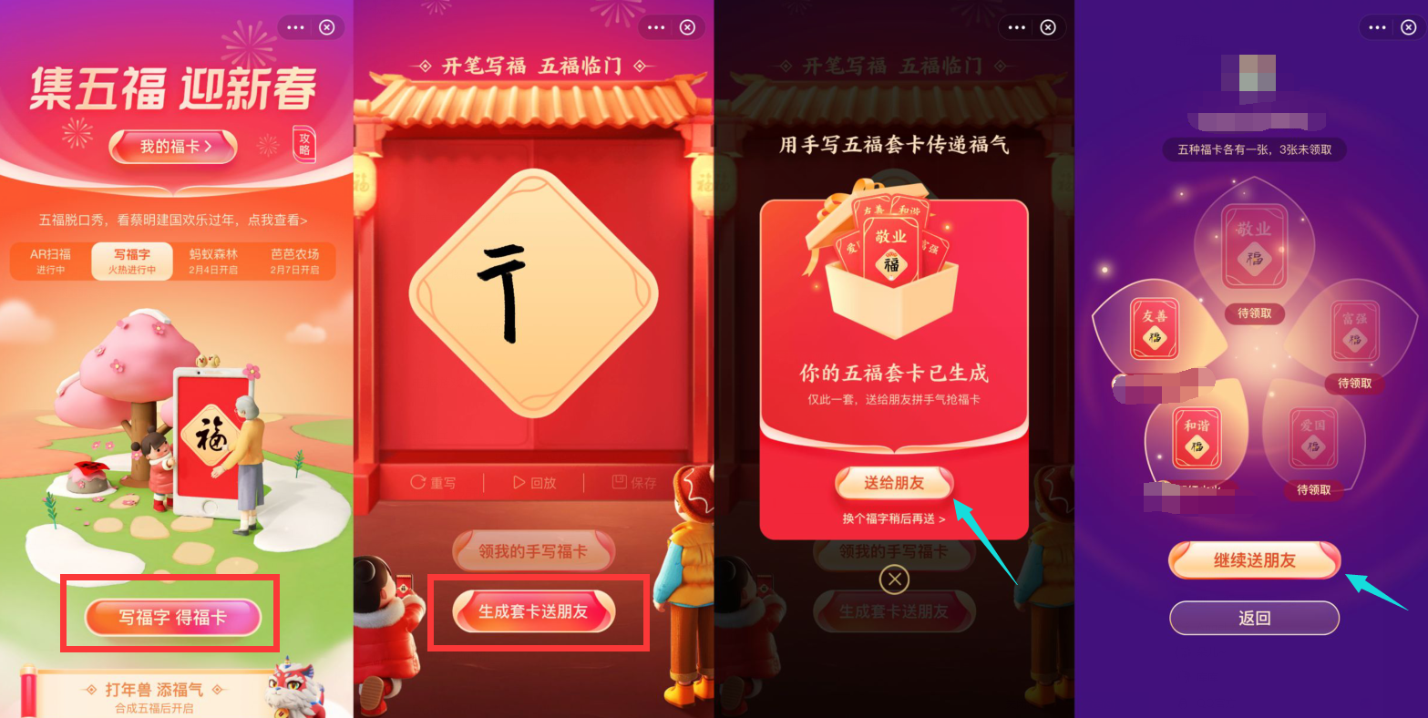 1、支付宝搜索“五福”->点横幅进入活动->点下面的写福字->得福卡