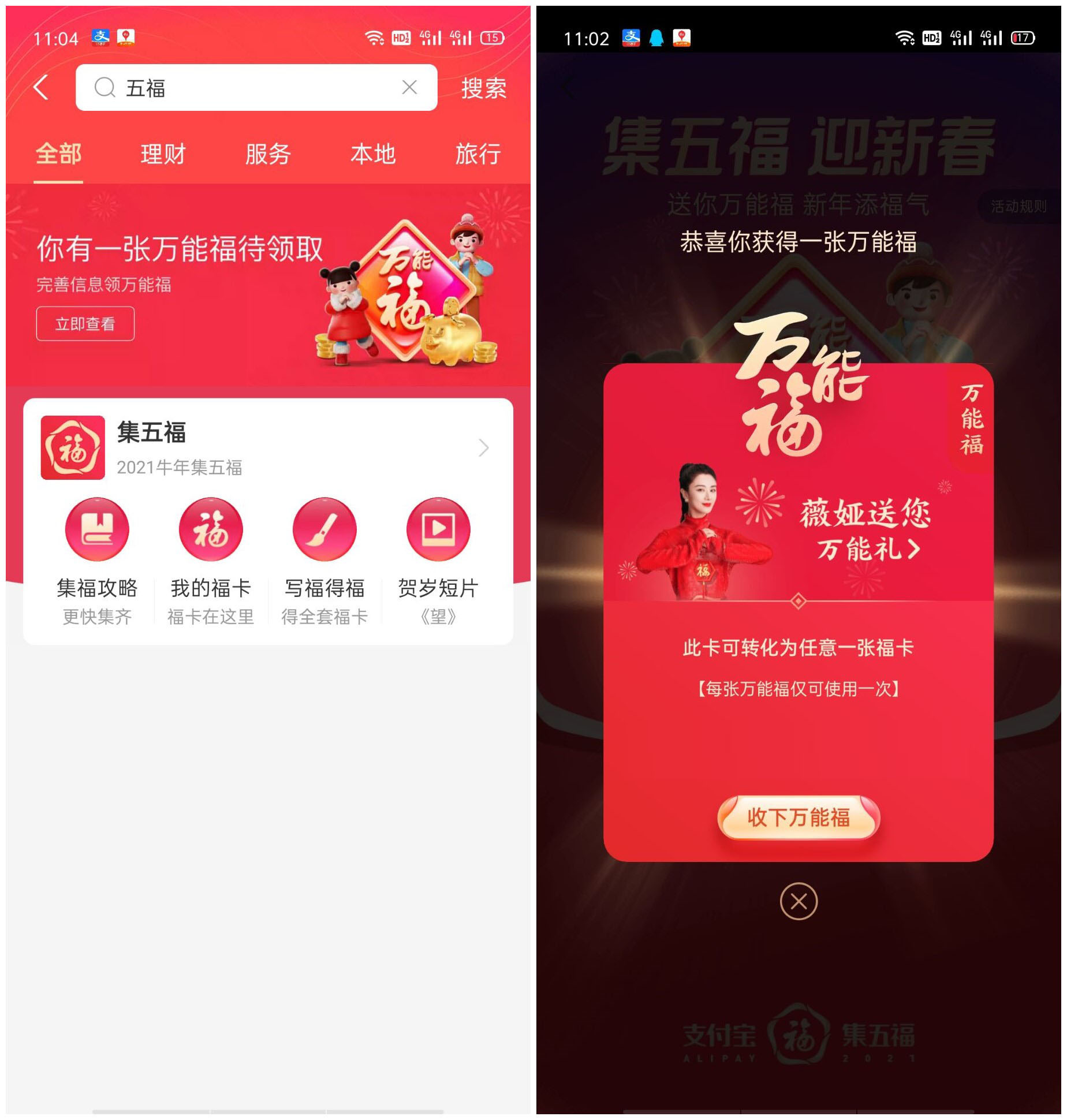 支付宝搜索“五福”->搜出来横幅就有入口->点进去直接领取即可->自己领了记得分享给朋友!