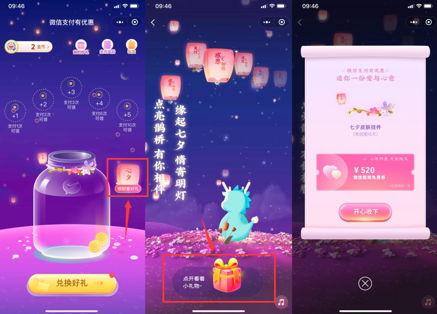 1、微信小程序搜索“微信支付有优惠”->进来后点右侧边“七夕好礼”->按照提示做操作->显示520