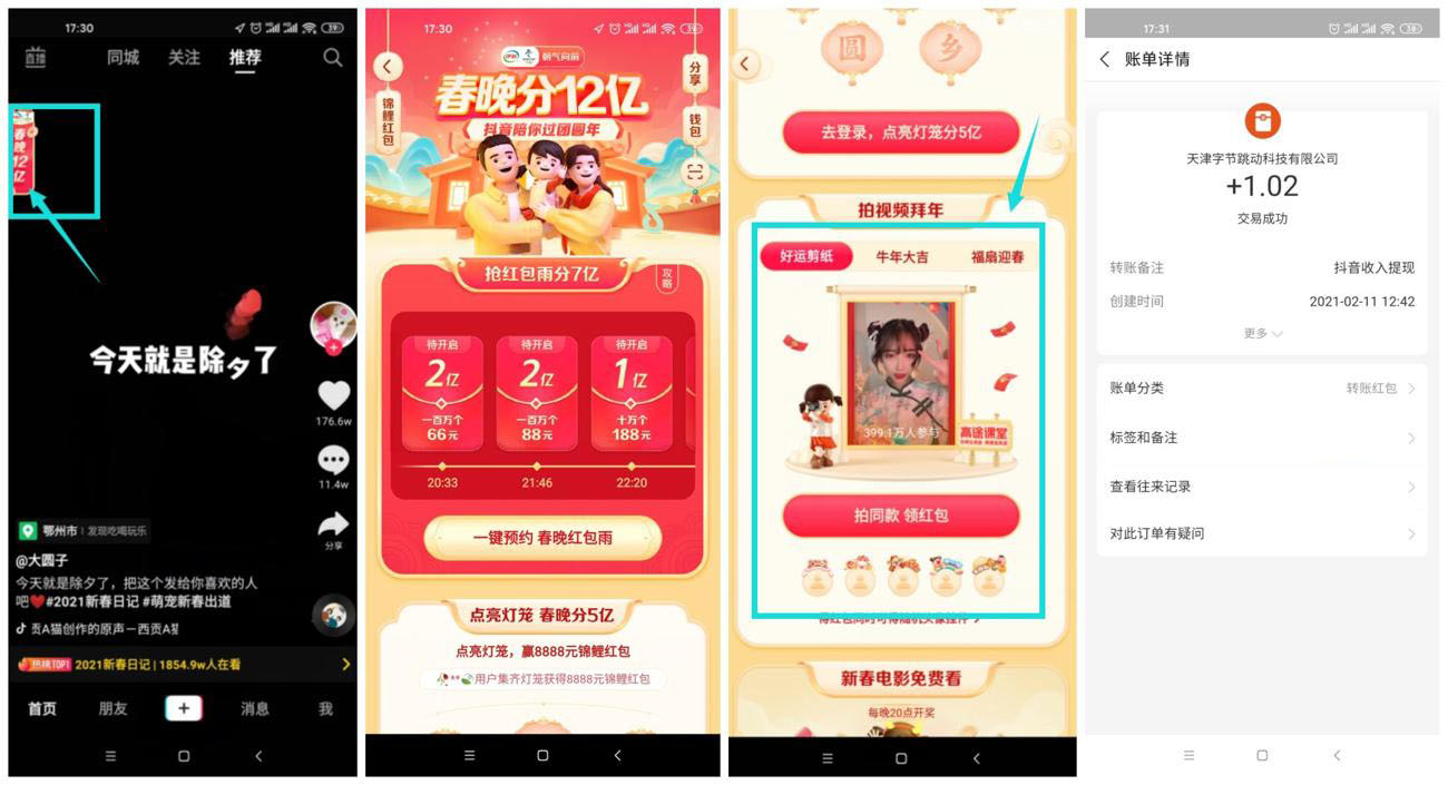 1、打开抖音APP->首页->左上角->春晚21亿->等待时间开启去抢->抽到红包后点击翻倍