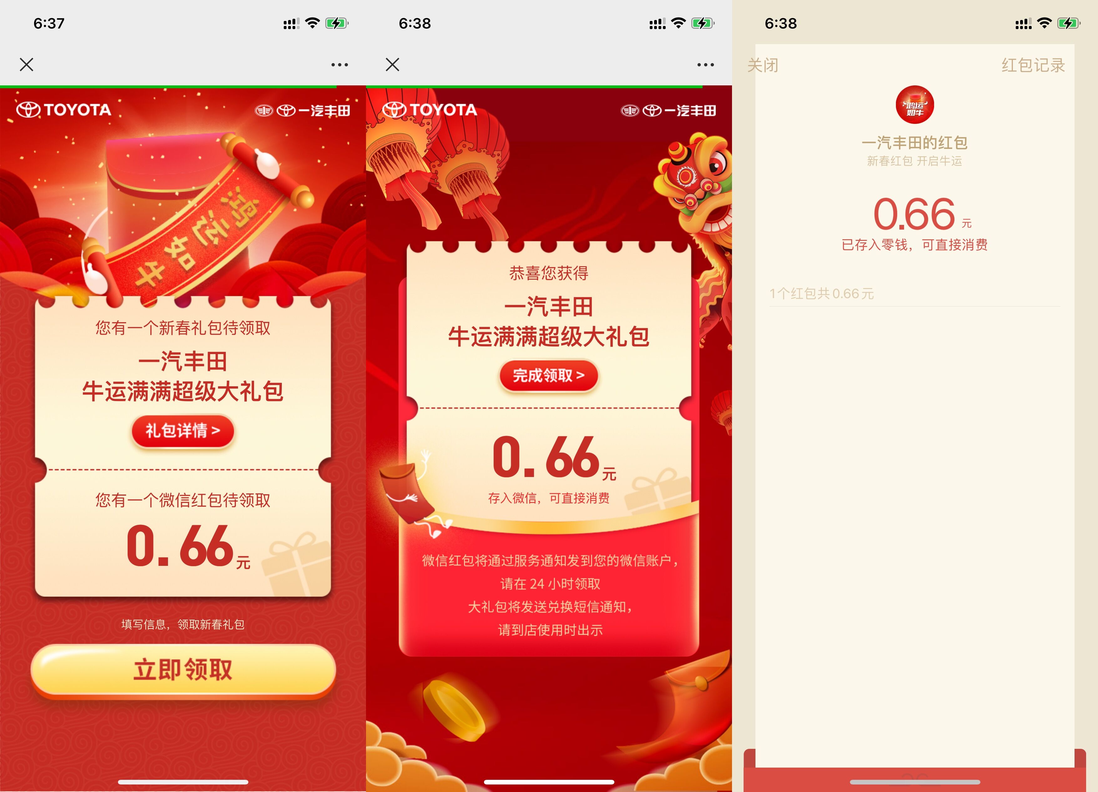 一汽丰田抽0.66~1.88元红包