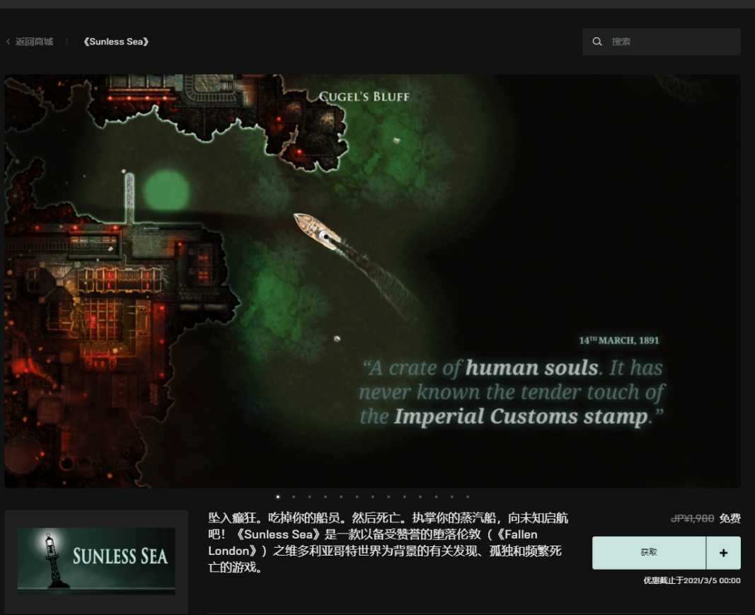 活动地址:https://www.epicgames.com/store/zh-CN/p/sunless-sea