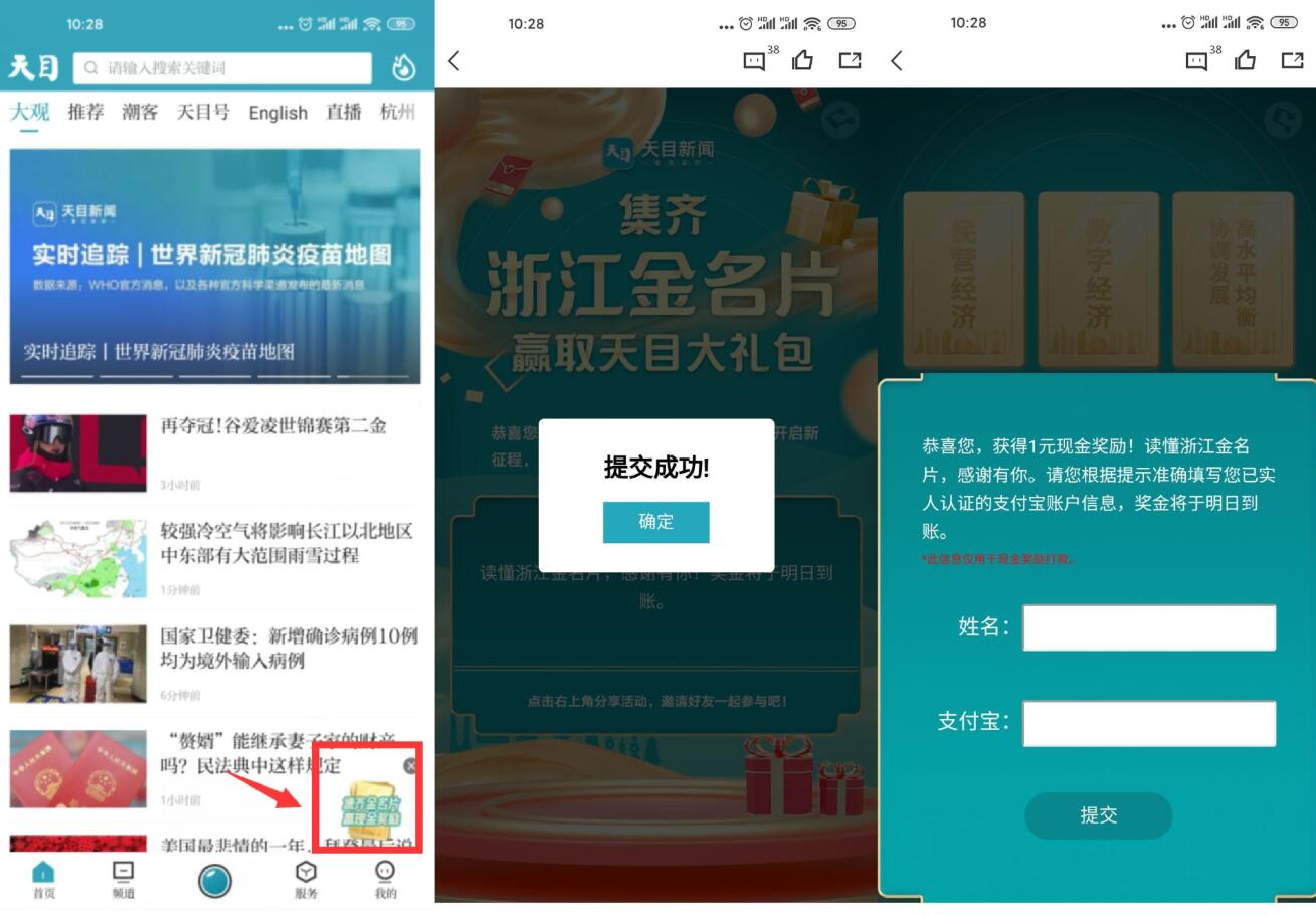 下载天目新闻APP->首页右下角->集齐金名片->答对8题必中1元->答对9题瓜分随机红包->两种奖励只能选一种->红包第二天到!
