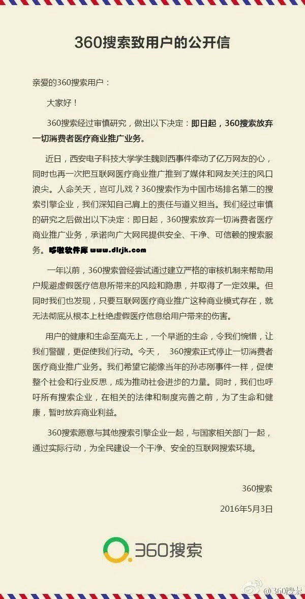 值得注意的是,早在 2016 年,在魏则西事件后,360 搜索就曾发表过公告,表示放弃消费者医疗商业推广业务。
