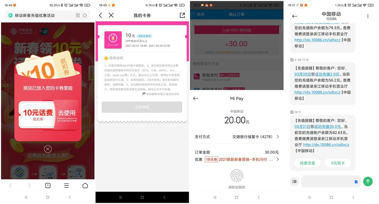1、打开地址领取成功后->去中国移动APP充30元话费->勾选优惠券->确认订单页面支付方式必须选手机闪付支付