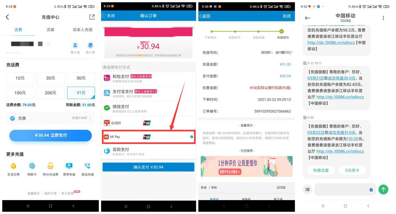 1、打开中国移动APP->首页->充值缴费->选择30元(如果实付是29元左右就返回自定义充31元)->确认订单页面勾选闪付(pay)支付