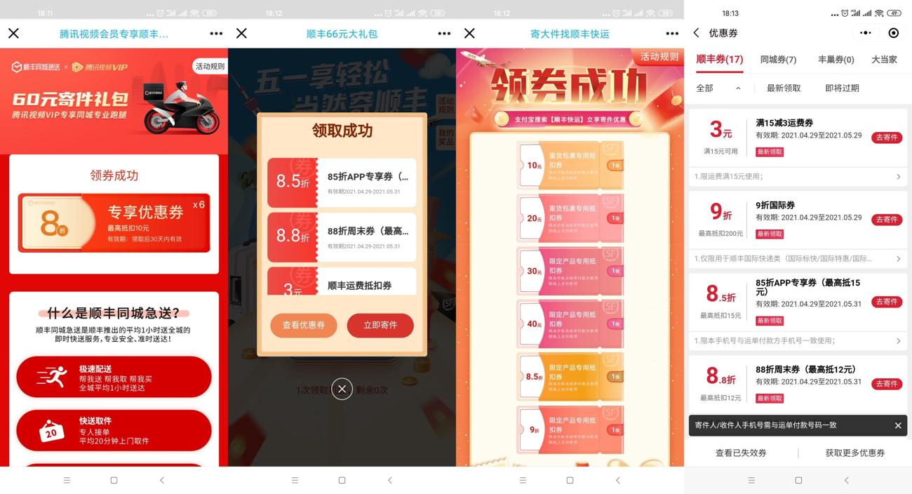 第一个包含5折~8折同城寄件券,第二个包含8.8折和3元券,第三个包含8.5折~9折寄大件优惠券
