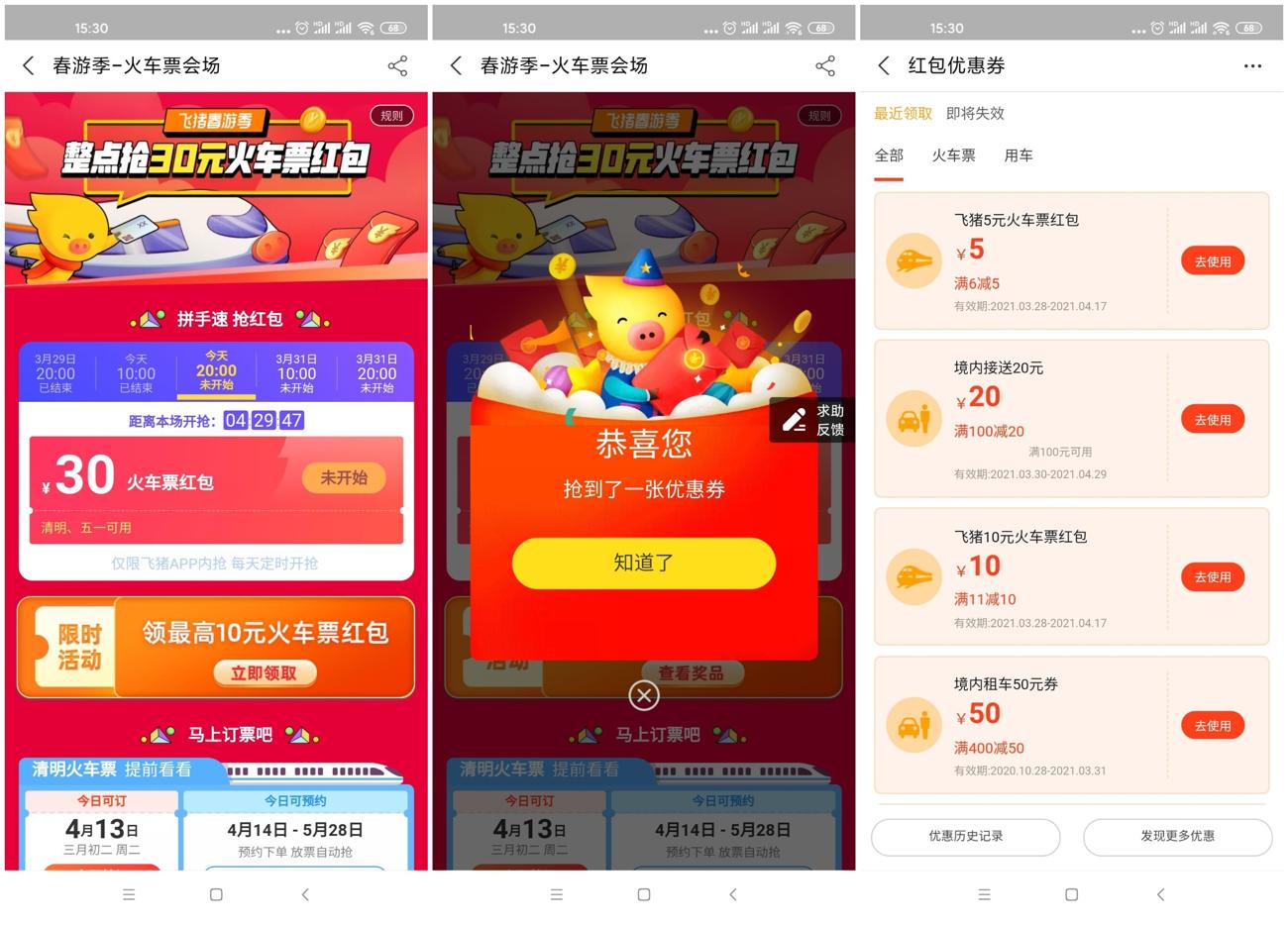 2、券有效期18天->近期要出行先领到随时无->另外还有3个时段可抢30元火车票券