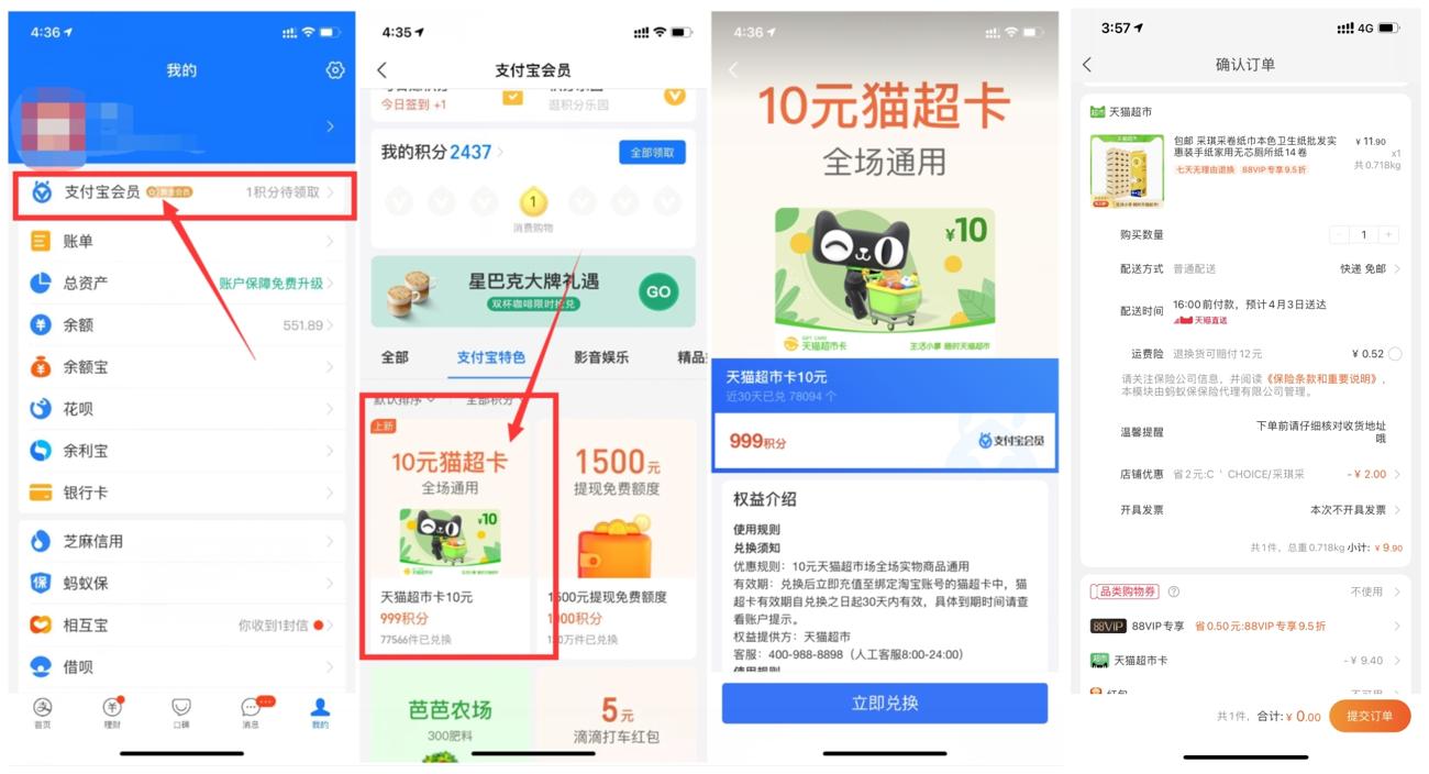 支付宝兑换10天猫超卡0撸实物