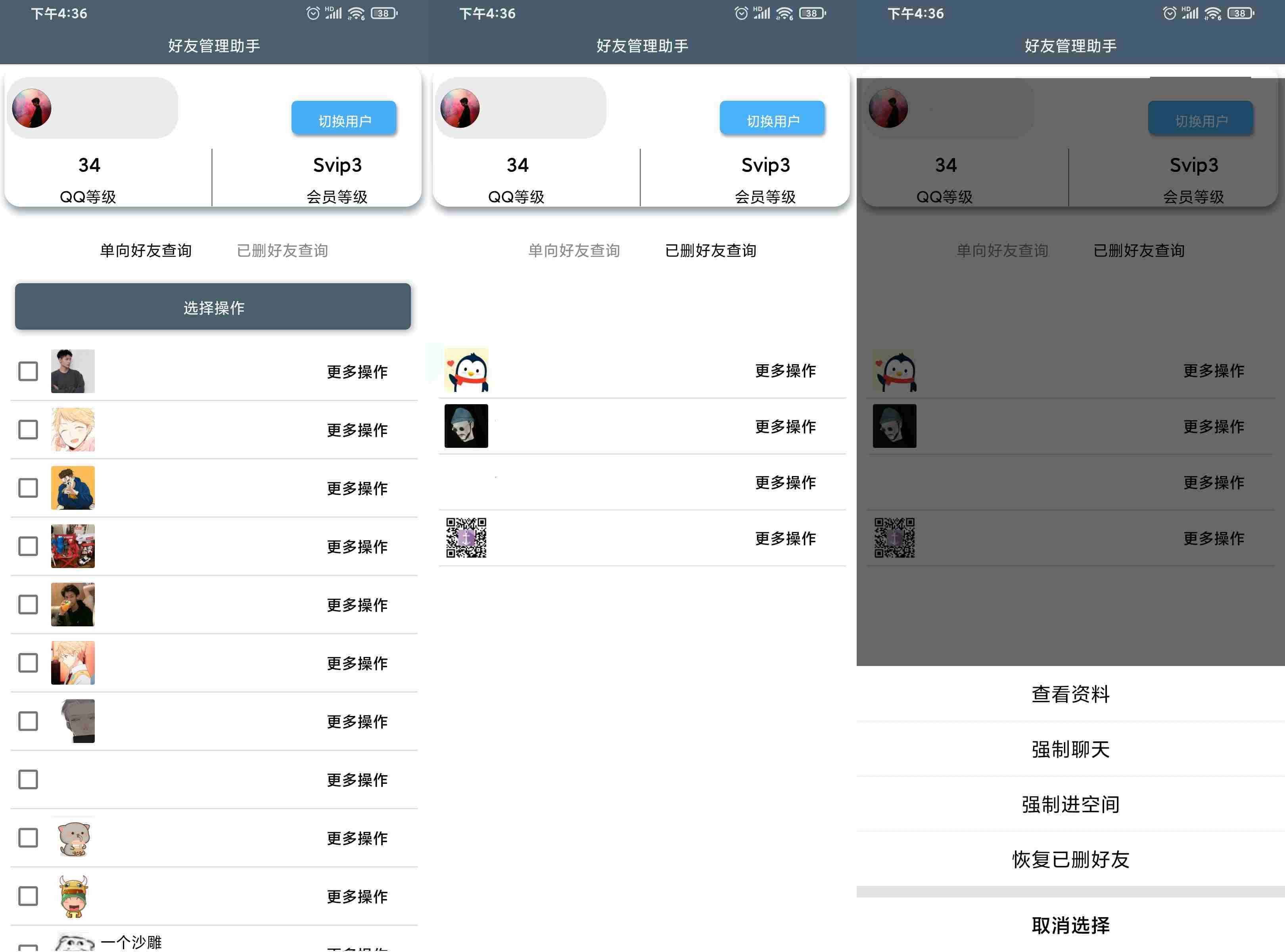 QQ好友管理助手一键精简好友列表,快速查看谁删了你你删了谁,支持一键恢复、强制进空间、强制聊天等功能。
