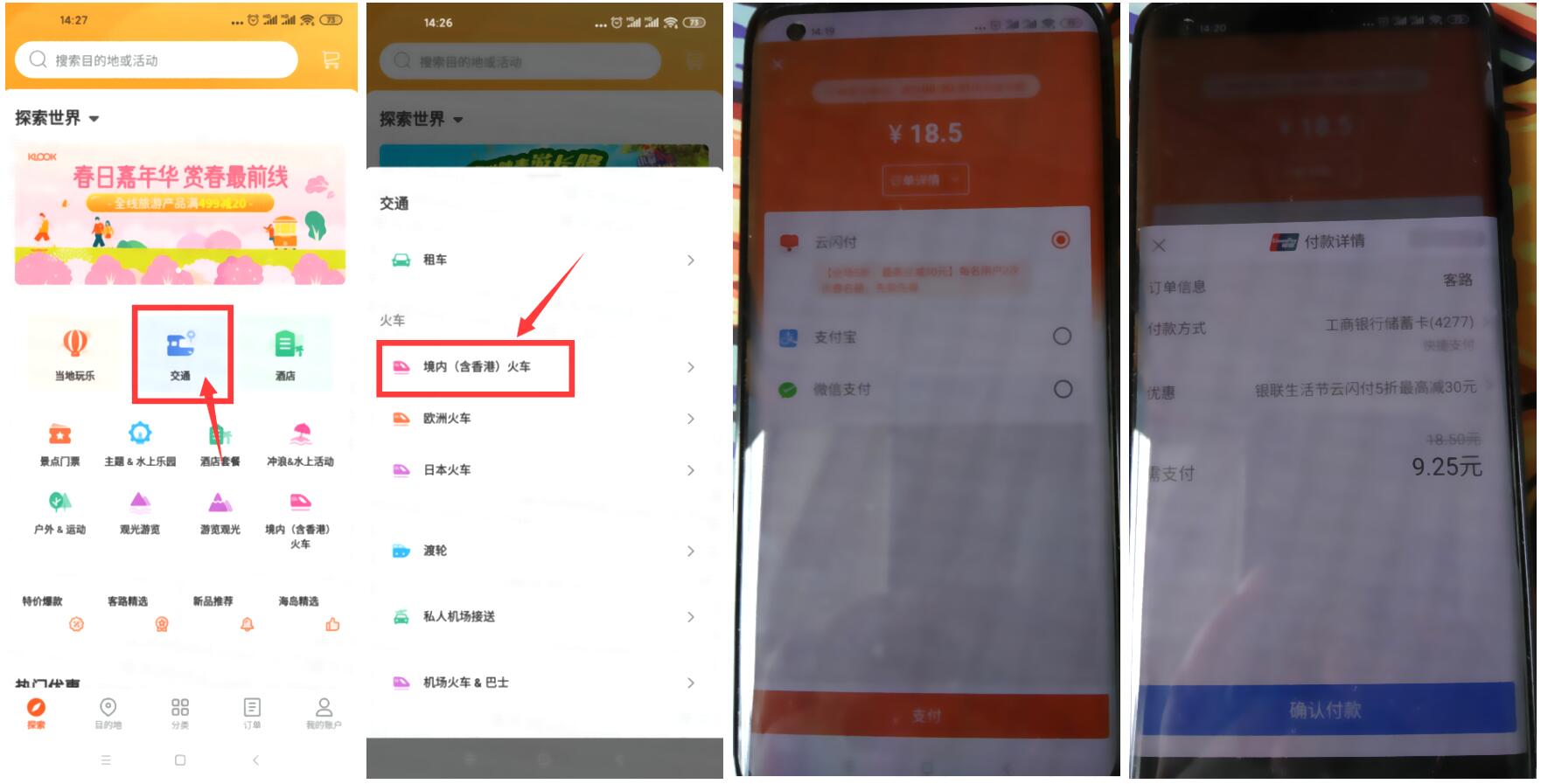 1、应用商店下载“客路旅行”->首页->交通->境内火车->购买火车票->选择“云闪付”或“pay”