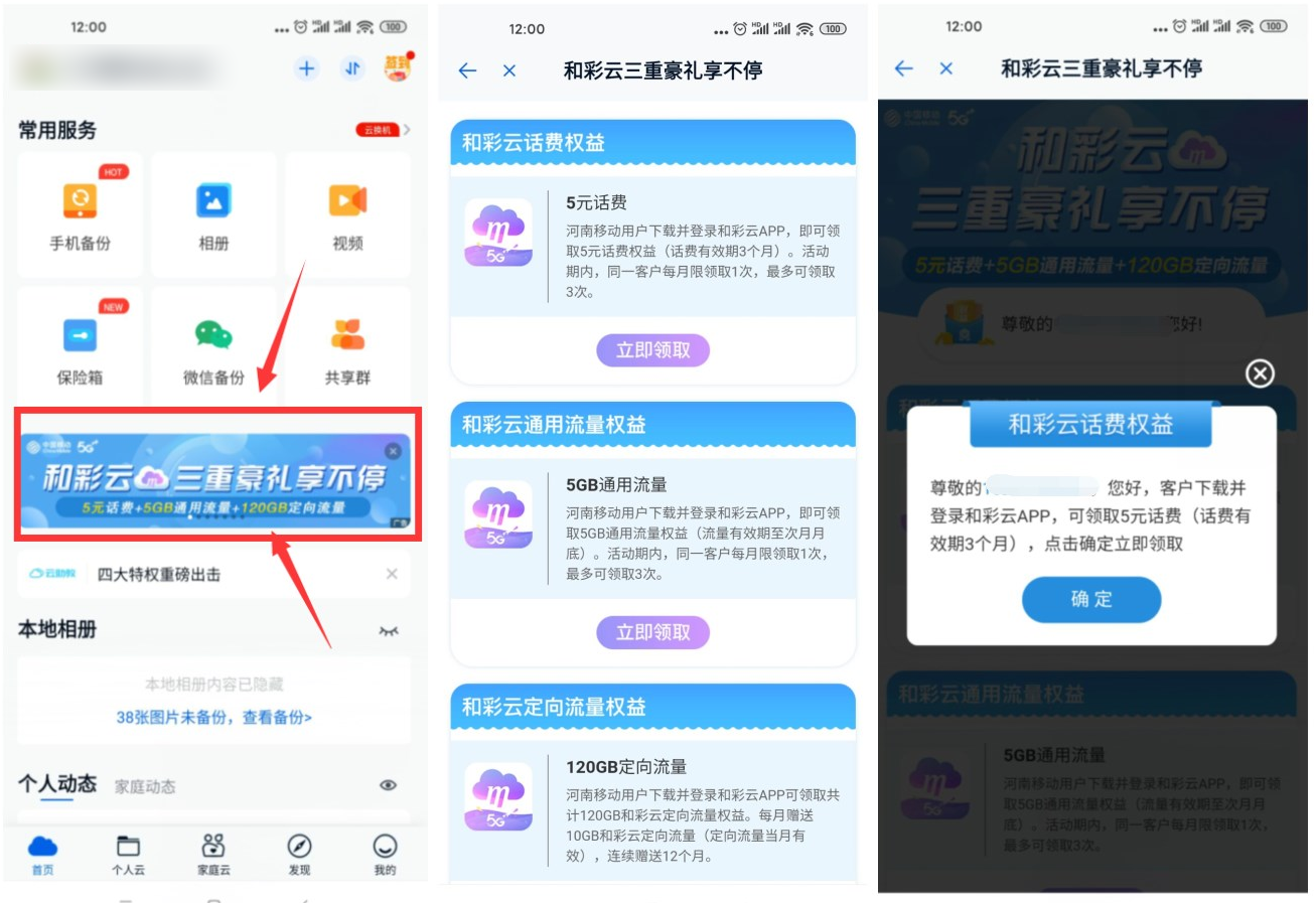 和彩云老用户就直接从2.5G链接下载APP!登录后点首页中间轮播图(如图一)->左滑有没有领话费领流量活动