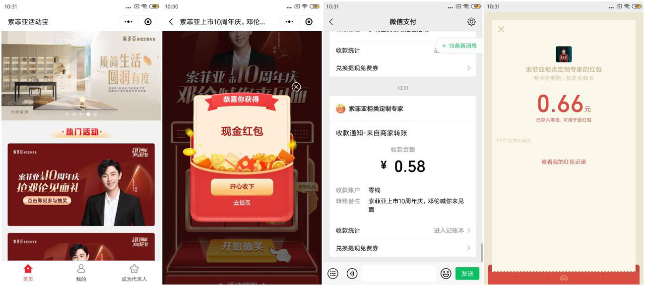 微信小程序搜索“索菲亚活动宝”->进去点10周年庆->抽红包机会用完->中了按照提示手动点奖品提现