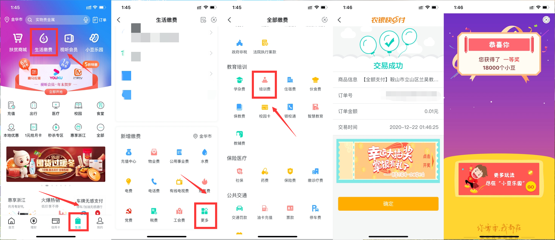 3、缴费后下方抽奖抽中金豆返回-农行APP-我的->进入金豆兑换页面兑换实物!