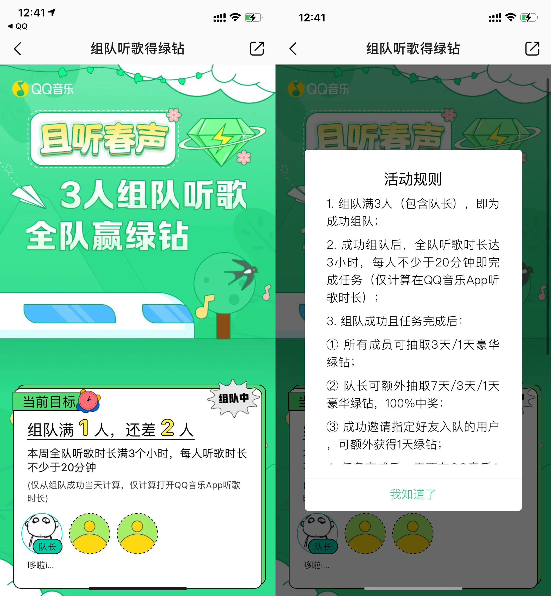 打开地址->跳转到QQ音乐APP参加->邀2人组队->全队听歌每人不少于20分钟就算完成->队长必中->队员抽奖