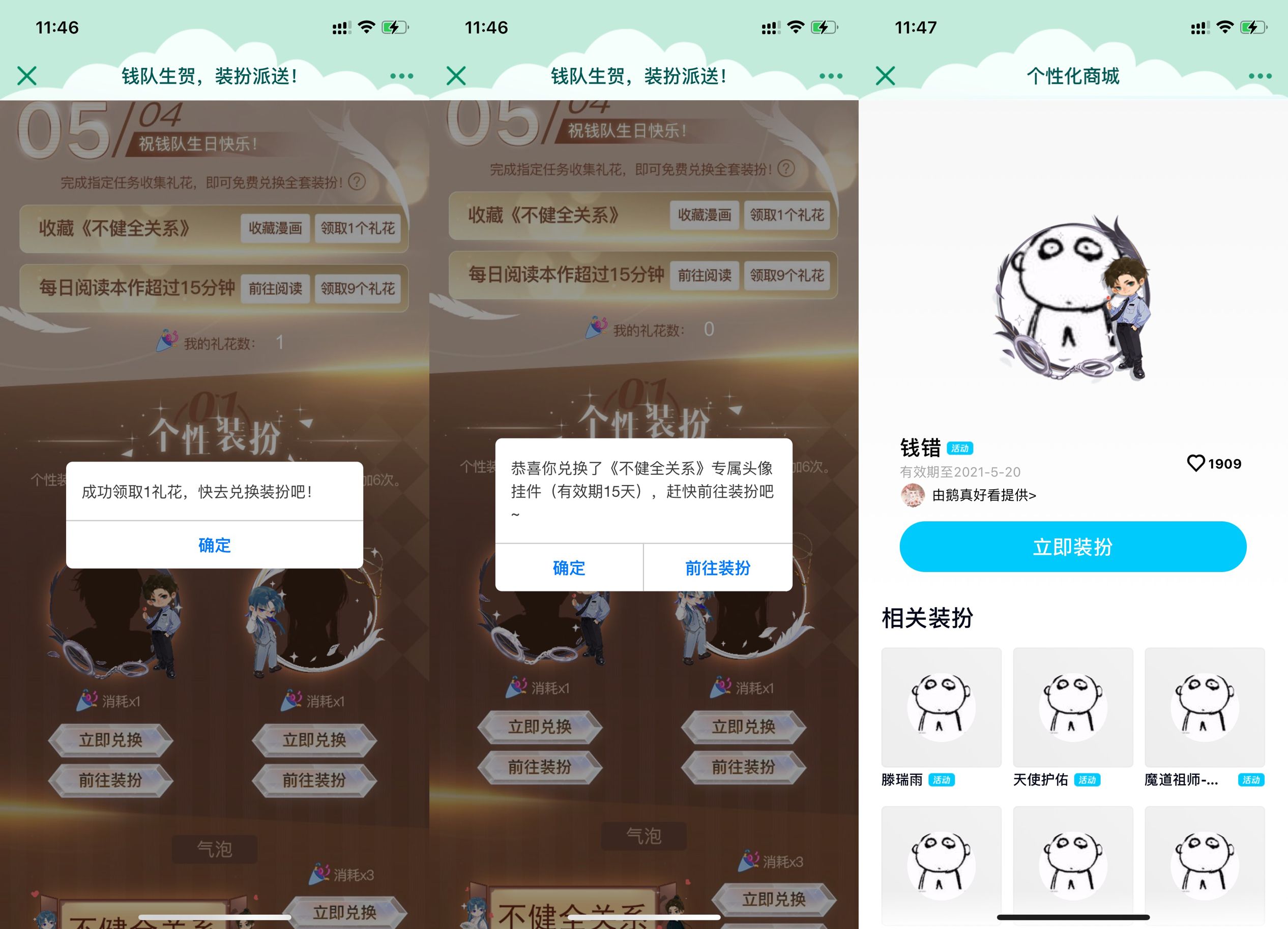 【免费领不健全关系QQ装扮】打开点收藏一下漫画并领取礼花->然后可兑换头像挂件->下拉还有主题汽泡可以兑换。
