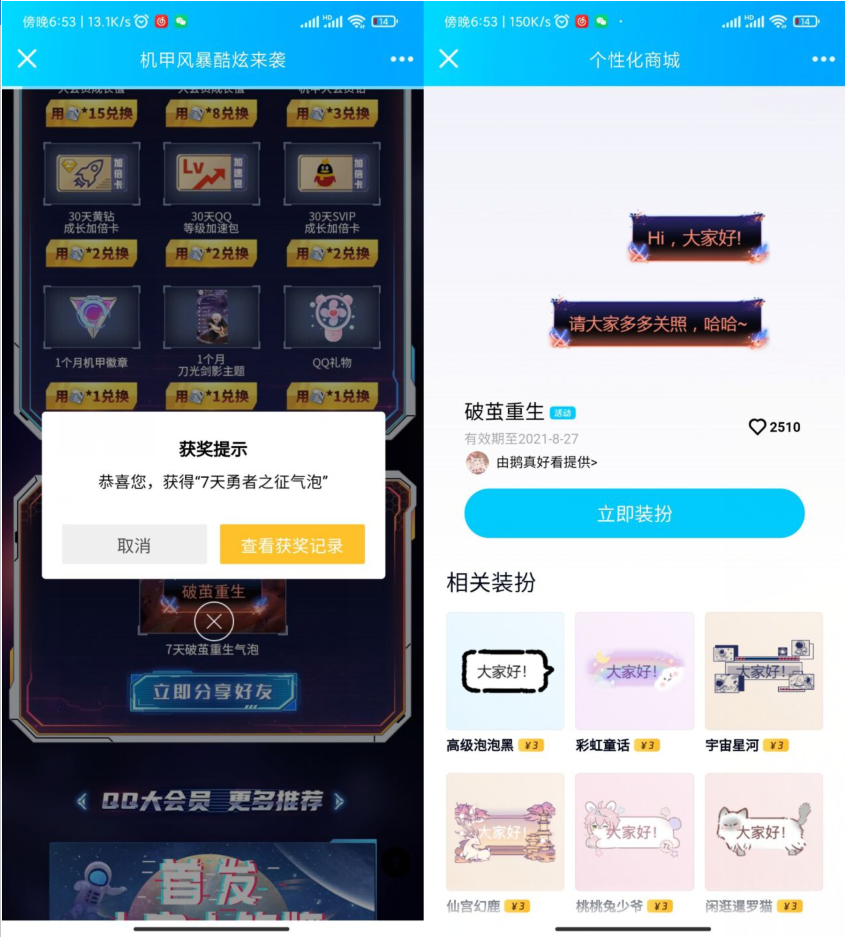 1、手机QQ打开->下拉页面->选择喜欢的款式点击领取->有头像框、气泡、主题、名片、背景、挂件