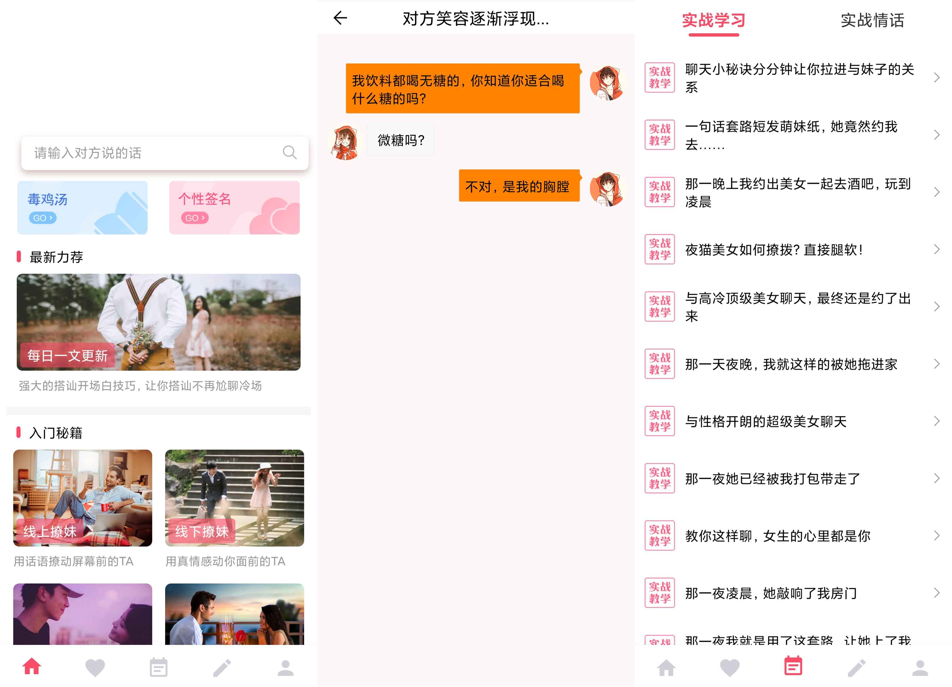 表白撩妹没门路,想要聊骚词不足,不要慌,恋爱话术大师多场景解读,超多话术库帮你解惑,多种套路帮你快速得到女神的青睐,正所谓自古套路得人心。(解锁vip)
