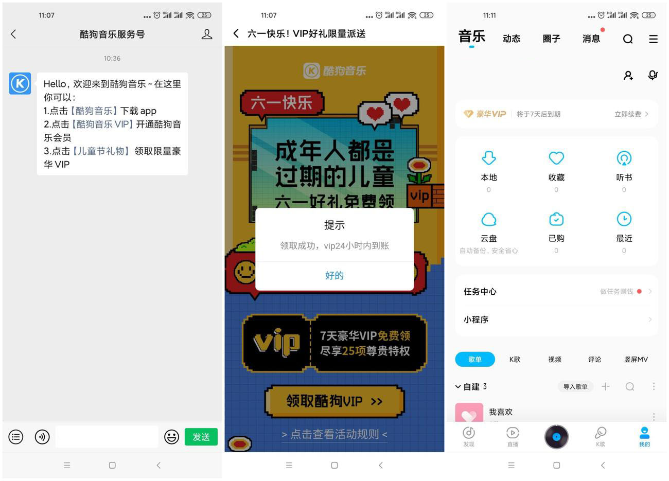 微信关注公众号“酷狗音乐服务号”->点推文“儿童节礼物”->进去跳转到酷狗音乐APP微信登录领取即可
