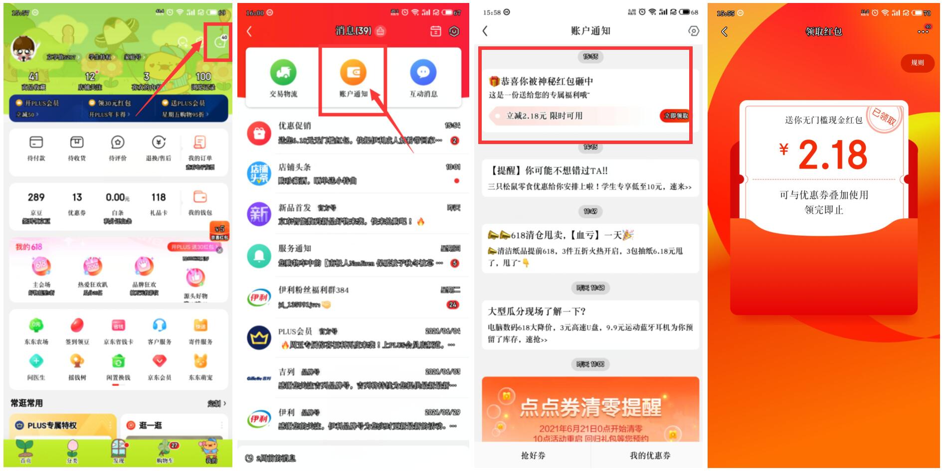 2、不管有没提示红包还是优惠券都去我的->右上角消息->账户通知->看有没有提示红包领取!