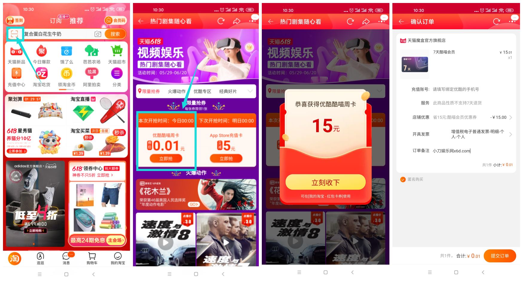 打开手机淘宝->左上角扫码进入活动->优酷酷喵周卡立即抢->领券后跳转到购买页面->1分下单即可!