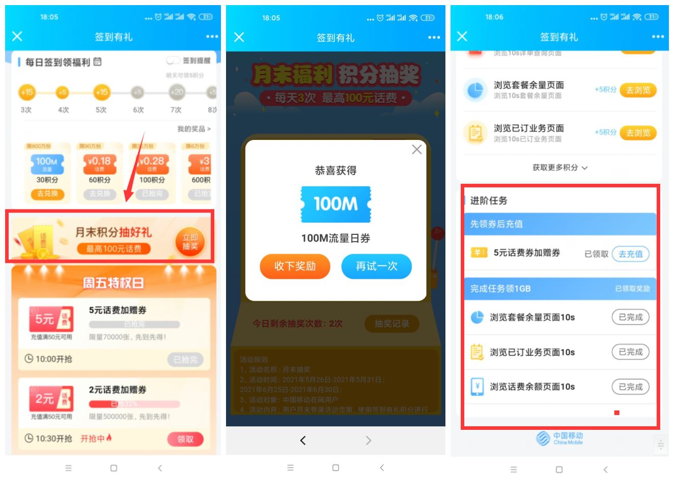 2、然后返回下拉到底->进阶任务可领5元话费加赠券(50充55话费)+1G流量->中了流量券要去移动APP卡券手动激活