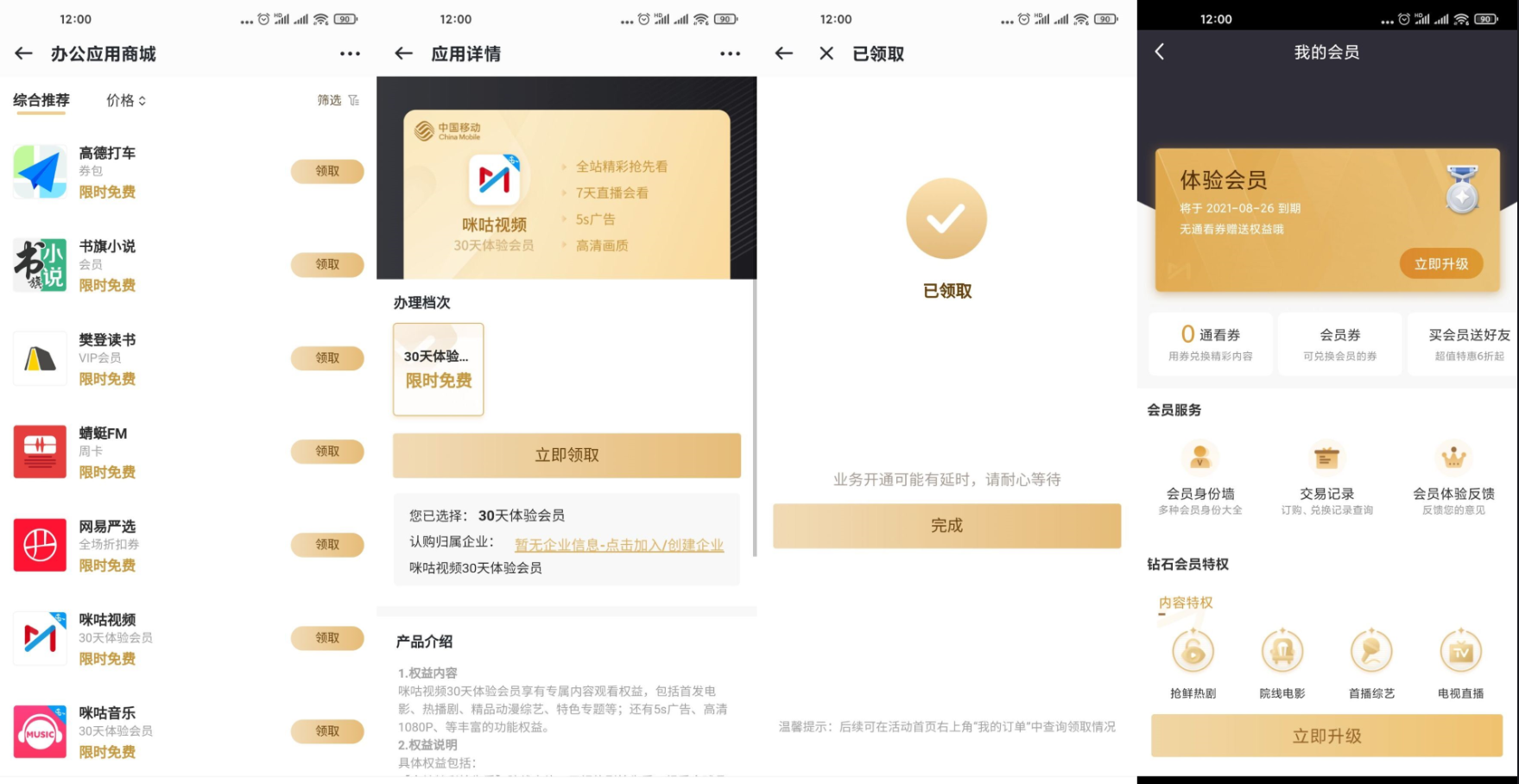 1、下载中移移动办公APP->登录后点活动->限时免费更多->领取即可->各种咪咕会员都有