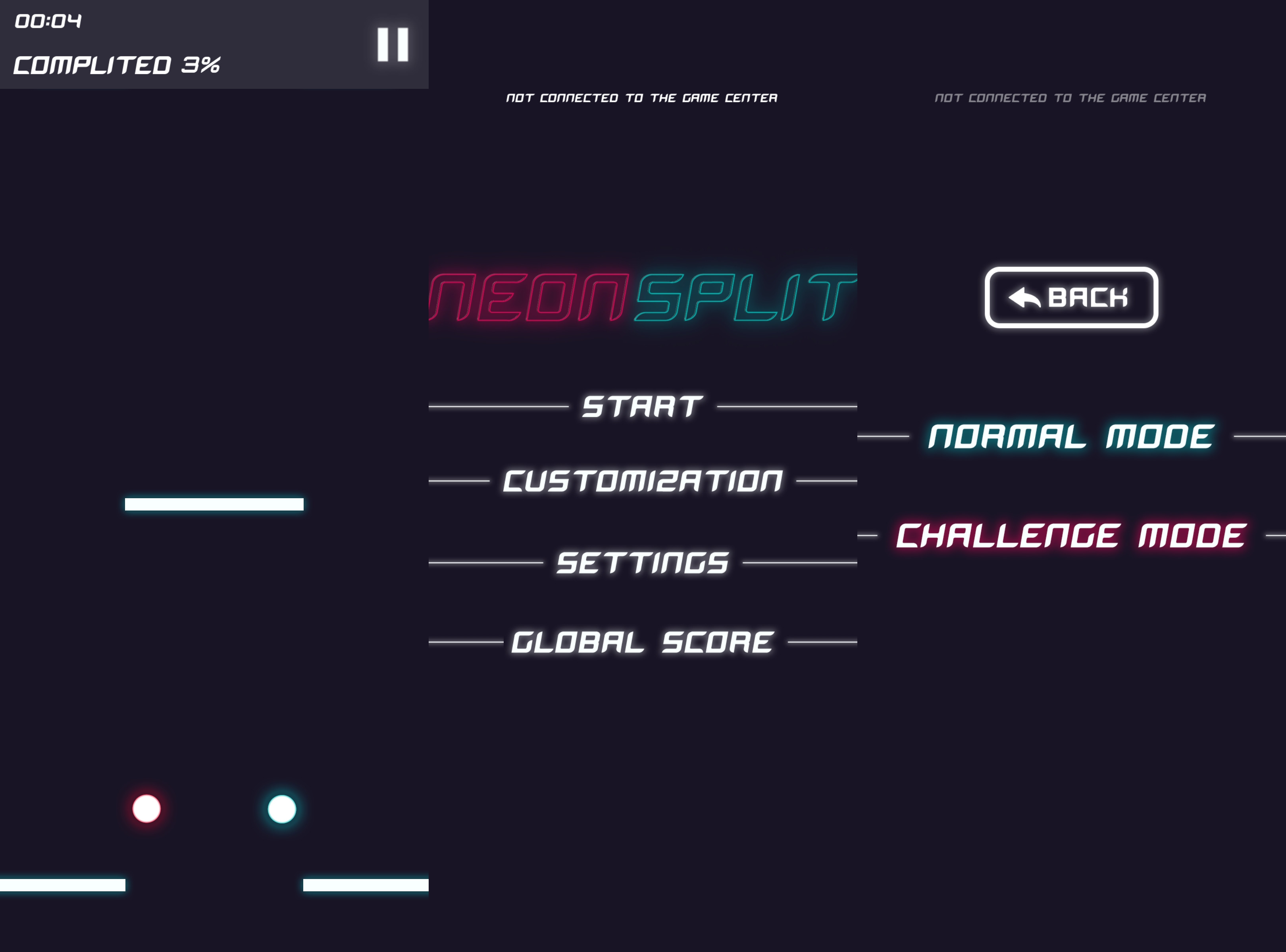 霓虹分离是一款动感的闯关游戏。看似简单的关卡其实极具挑战性,你需要同时控制两个小球通过各种各样的障碍,考验你的左右手调节能力,还在等什么快来体验吧。(免费体验全部)