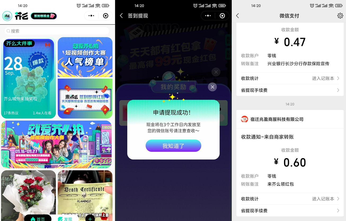微信小程序搜索“芥么”->进来后点顶部->签到领现金->进去点一下->收下再点奖励->手动提现秒到