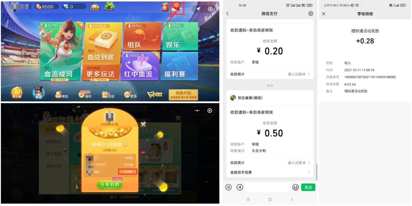 2、第三个号拆开必中0.5元->一号只能领一次红包->另外两个号也循环操作->顺序对了不错->其它两号也能领到红包!