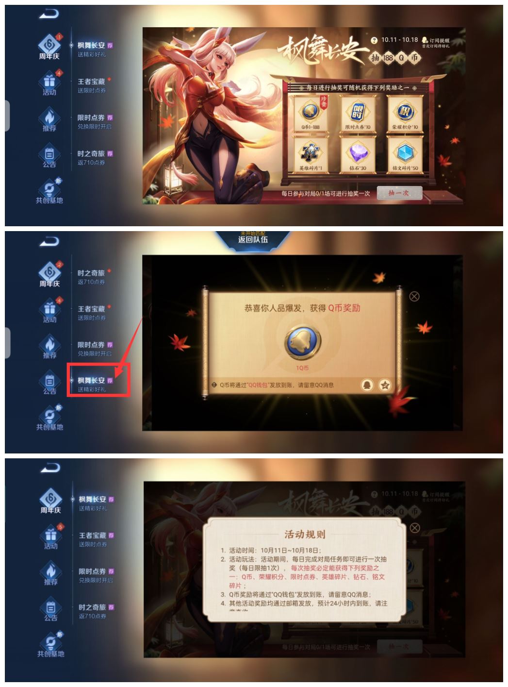 1、打开王者荣耀->活动->枫舞长安->每天玩一局游戏就可以抽奖