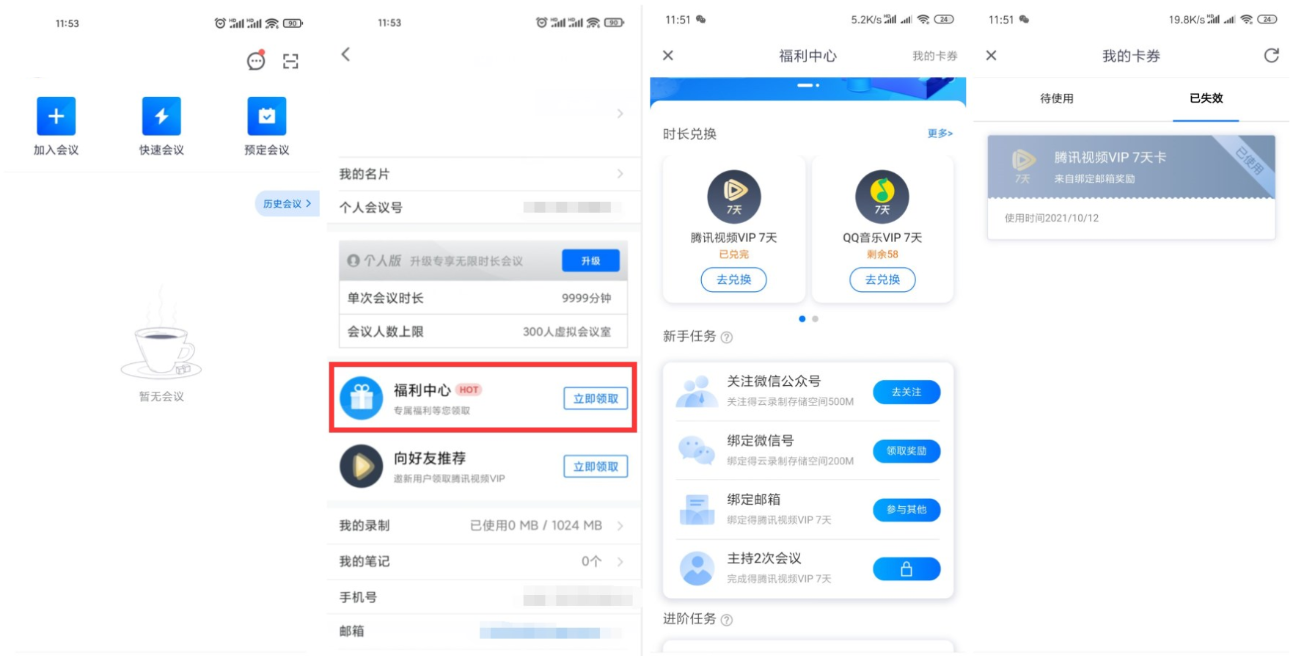 1、下载打开腾讯会议APP->登录后点头像->福利中心->下拉页面->绑定邮箱领7天->去使用兑换即可到账->另外点击