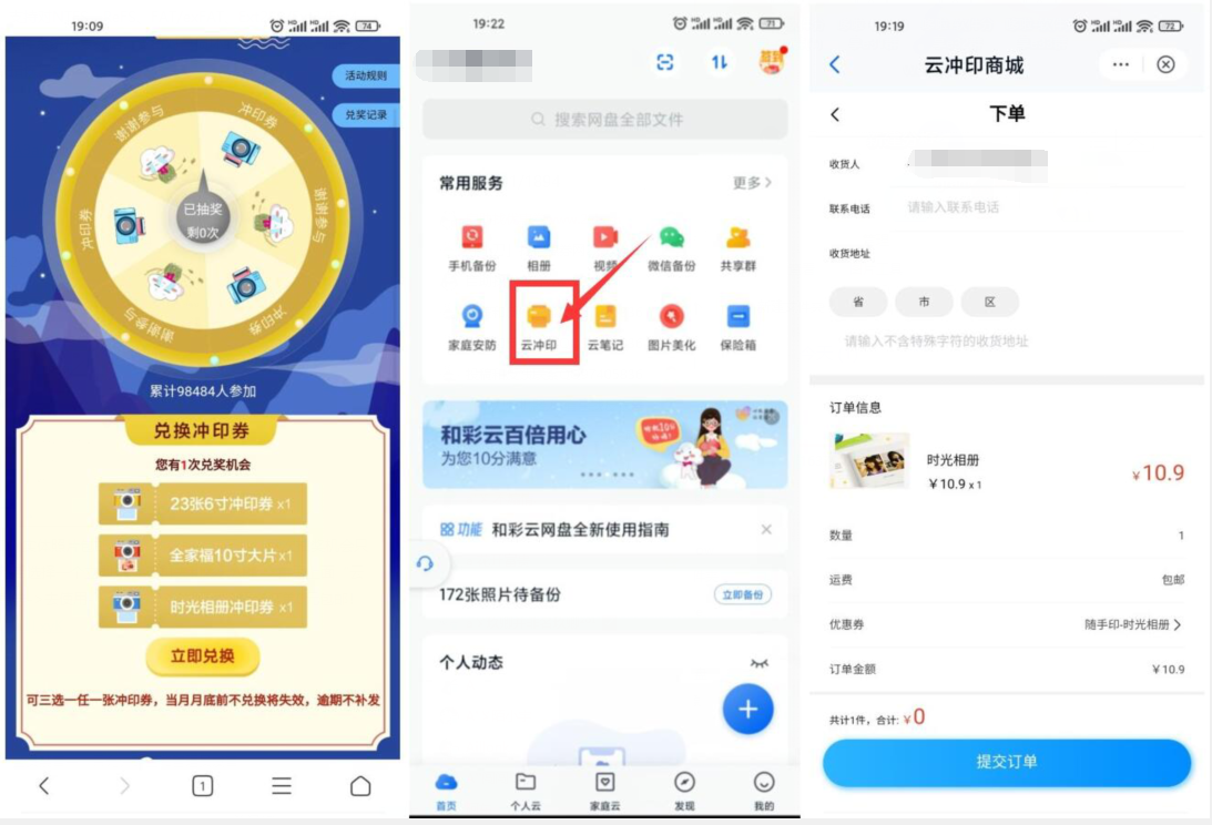 1、打开地址两次抽奖机会只认抽中冲印券->然后选择一个立即兑换->再去和彩云APP->首页上面“云冲印”