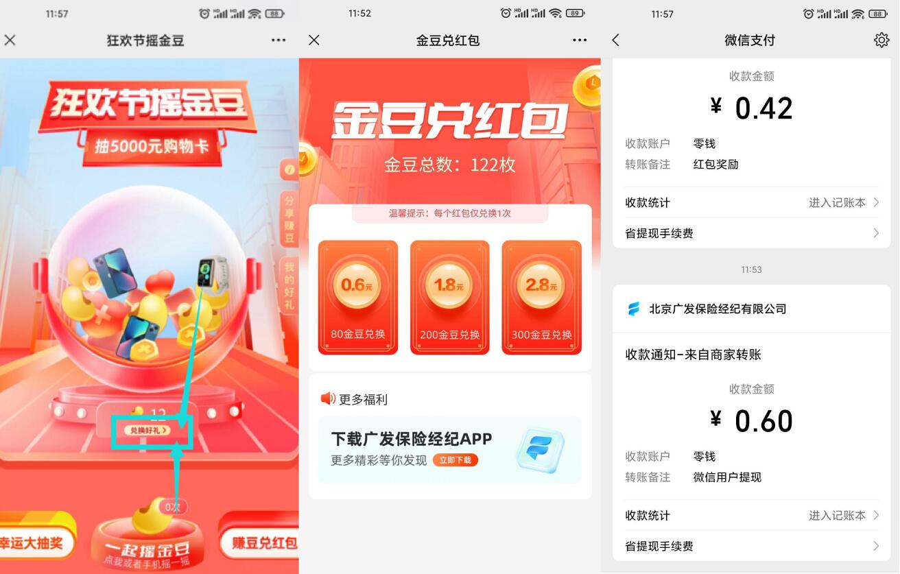 1、微信打开点小程序进入->开始有默认5次抽红包机会用完->再点赚豆兑红包->完成简单任务->累计80个金豆兑换0.6元