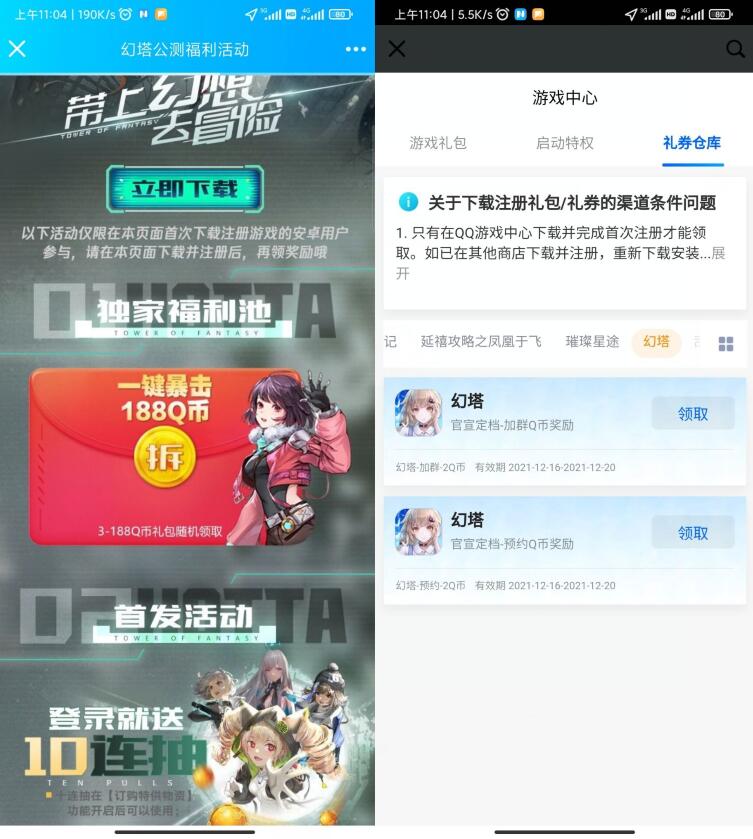 安卓卡券Q币(选幻塔):https://speed.gamecenter.qq.com/pushgame/v1/gift/index?_wv=18950115&_wwv=265&tab=2&pubAccountAppid